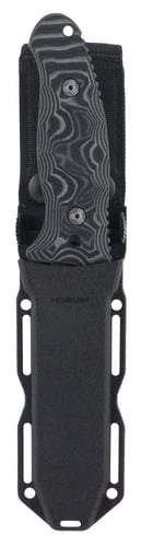 Hogue's fixed blade designs have been developed to meet the requirements of professionals and adventurers alike. Created specifically with the outdoorsman in mind, the EX-F02 features a black G-10 G-Mascus rubber handle for grip-ability and finger detent in the handle. The tumbled finished blade has a serrated thumb-ramp and hand honed edge. Handle has lanyard/lashing holes.